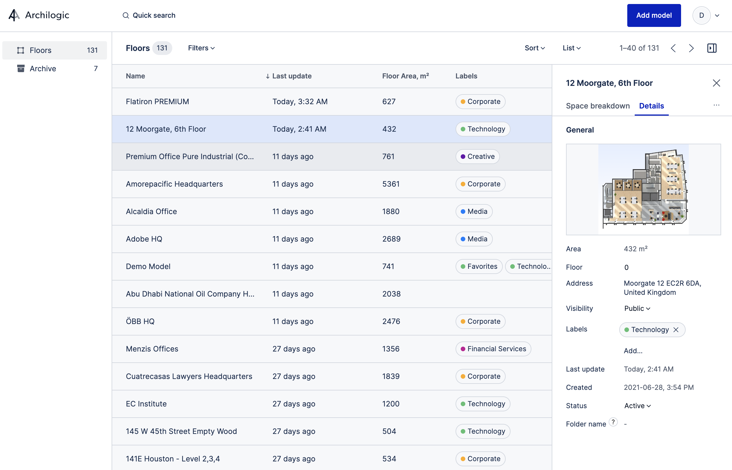 Get your largest asset class ready for AI. Archilogic turns your floor plans into standardized, graph-based 3D representations of space. That data can be queried within Archilogic, in connected systems like Microsoft Teams or Slack, and through custom integrations. A BIM-light you can actually use in operations