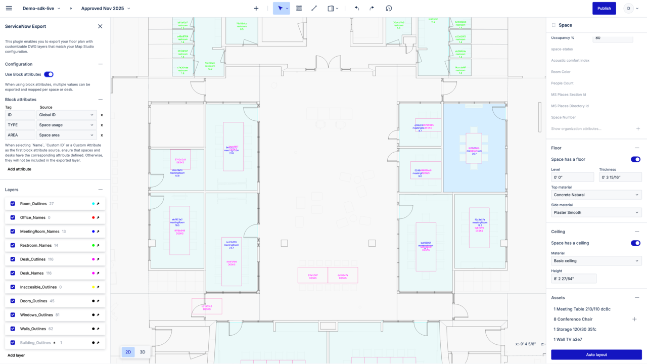 Connects IWMS, IoT, occupancy, and CAFM systems with one-click syncing. No polylining. No manual exports. Spatial data becomes the hub connecting Microsoft Places, ServiceNow, Slack, and other integrations